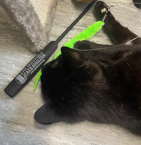 Another of the shelter’s cats, Jacob, playing with their new, branded cat wands.