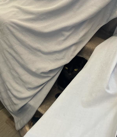 Nervous and shy shelter cat, Winny, given blankets and a cat tower for extra comfort and security.